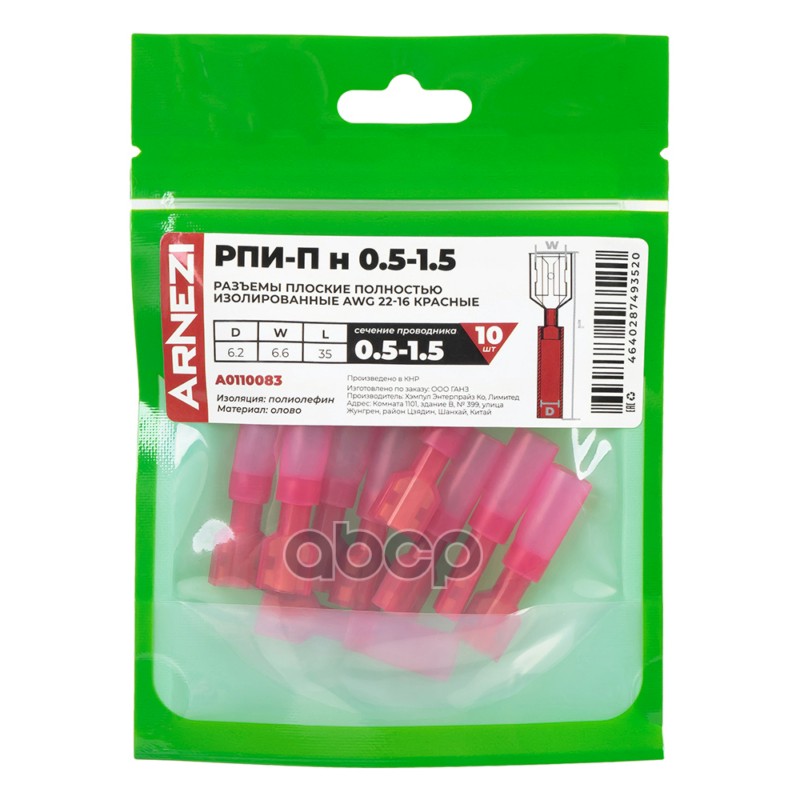 Купить запчасть A0110083 Разъемы плоские полностью изолированные РПИ-Пн 0.5-1.5 AWG22-16 10шт красные, , Max Вт ARNEZI с доставкой по России.
