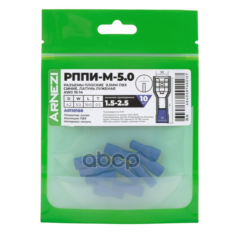 Купить запчасть A0110108 Разъемы плоские РППИ-М-4.80.5мм1.5-2.510шт ПВХ синие, латунь луженая AWG16-14, , Max Вт ARNE с доставкой по России.