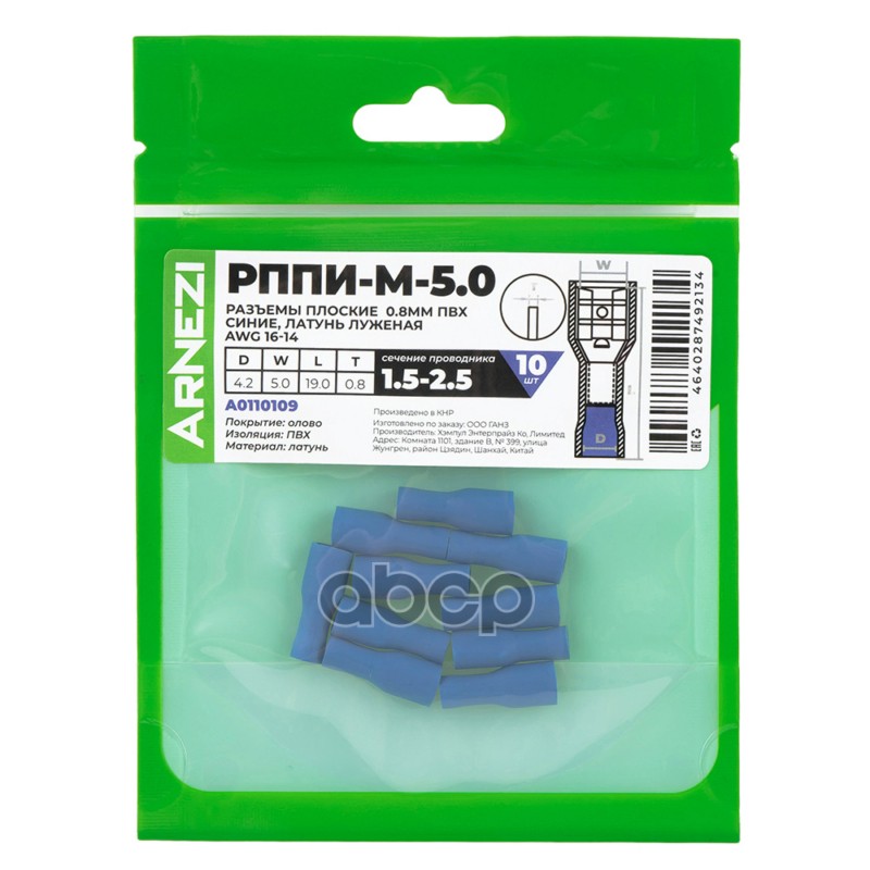 Купить запчасть A0110109 Разъемы плоские РППИ-М-4.80.8мм1.5-2.510шт ПВХ синие, латунь луженая AWG16-14, , Max Вт ARNE с доставкой по России.