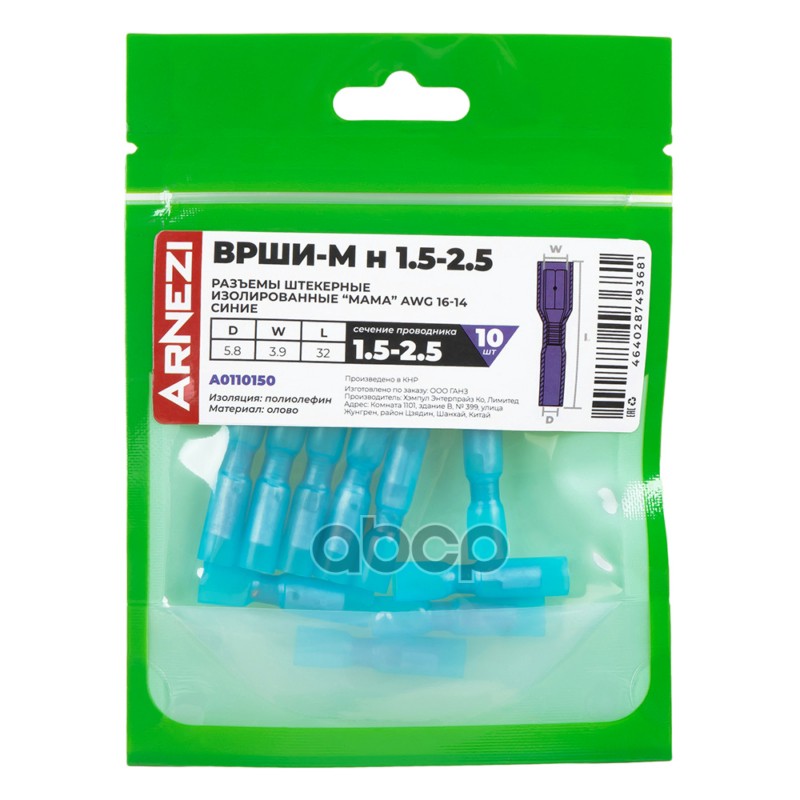 Купить запчасть A0110150 Разъемы штекерные изолированные мама ВРШИ-Мн 1.5-2.5 AWG16-14 3.9мм 10шт синие, , Max Вт A с доставкой по России.