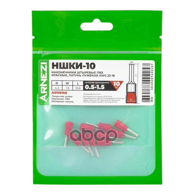 Купить запчасть A0110156 Наконечники штыревые НШКИ-10 0.5-1.510шт ПВХ красные, латунь луженая AWG22-16, , Max Вт ARNEZI с доставкой по России.