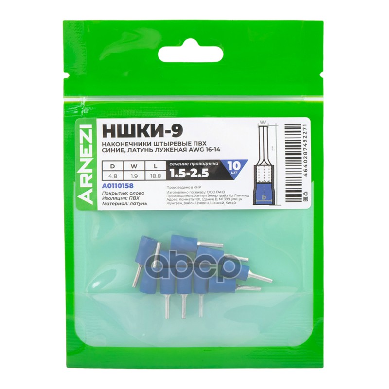 Купить запчасть A0110158 Наконечники штыревые НШКИ-9 1.5-2.510шт ПВХ синие, латунь луженая AWG16-14, , Max Вт ARNEZI A0 с доставкой по России.