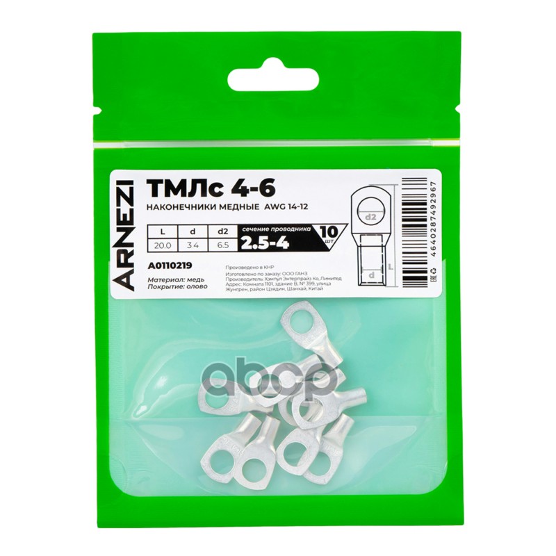 Купить запчасть A0110219 Наконечники медные ТМЛс 4-6 10шт, , Max Вт ARNEZI A0110219 с доставкой по России.