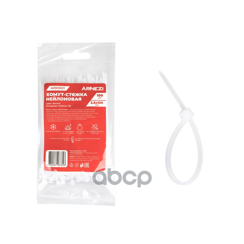 Купить запчасть A0903011 Хомут-стяжка нейлоновая 2.5x100 мм, белые 100 шт Arnezi A0903011 с доставкой по России.
