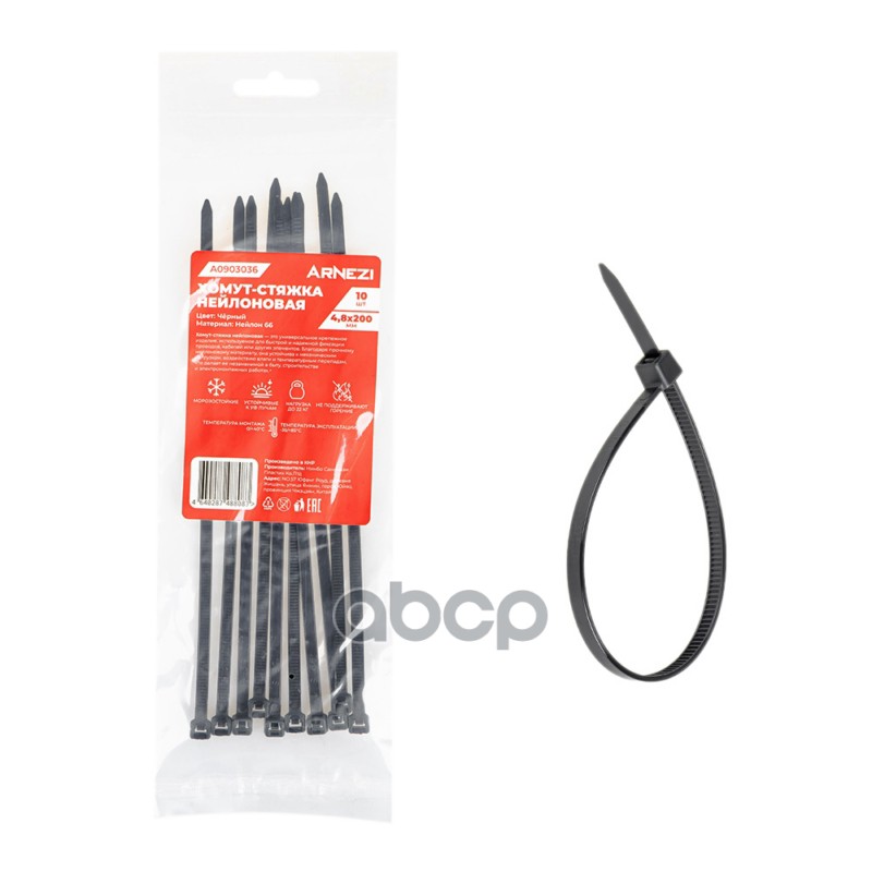 Купить запчасть A0903036 Хомут-стяжка нейлоновая 4.8x200 мм, черные 10 шт Arnezi A0903036 с доставкой по России.