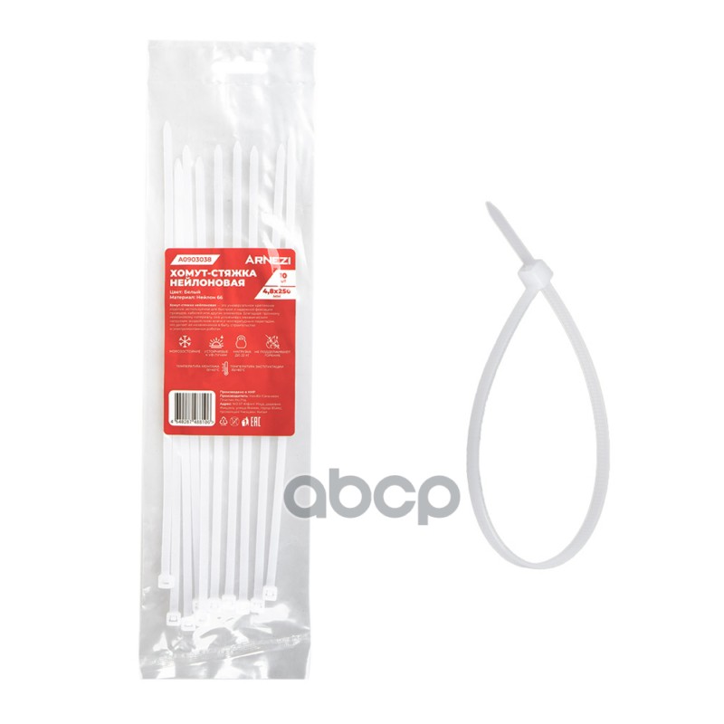 Купить запчасть A0903038 Хомут-стяжка нейлоновая 4.8x250 мм, белые 10 шт Arnezi A0903038 с доставкой по России.