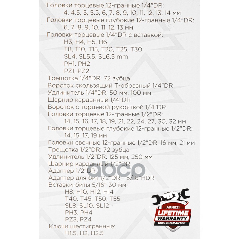Наименование: Набор инструментов 94 пр. 12-гранные головки 1/4DR, 1/2DR ARNEZI R0902094