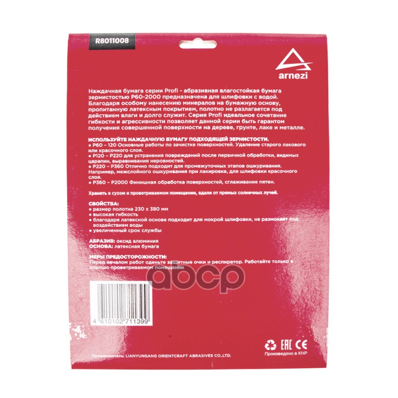 Наименование: Бумага наждачная водостойкая 230x280 мм P100 Profi (10шт) ARNEZI R8011008 Бумага наждачная водостойкая 230x280 мм P100 Profi (10шт) ARNEZI R8011008