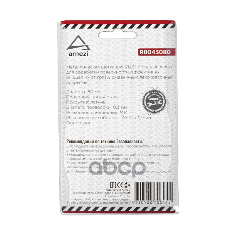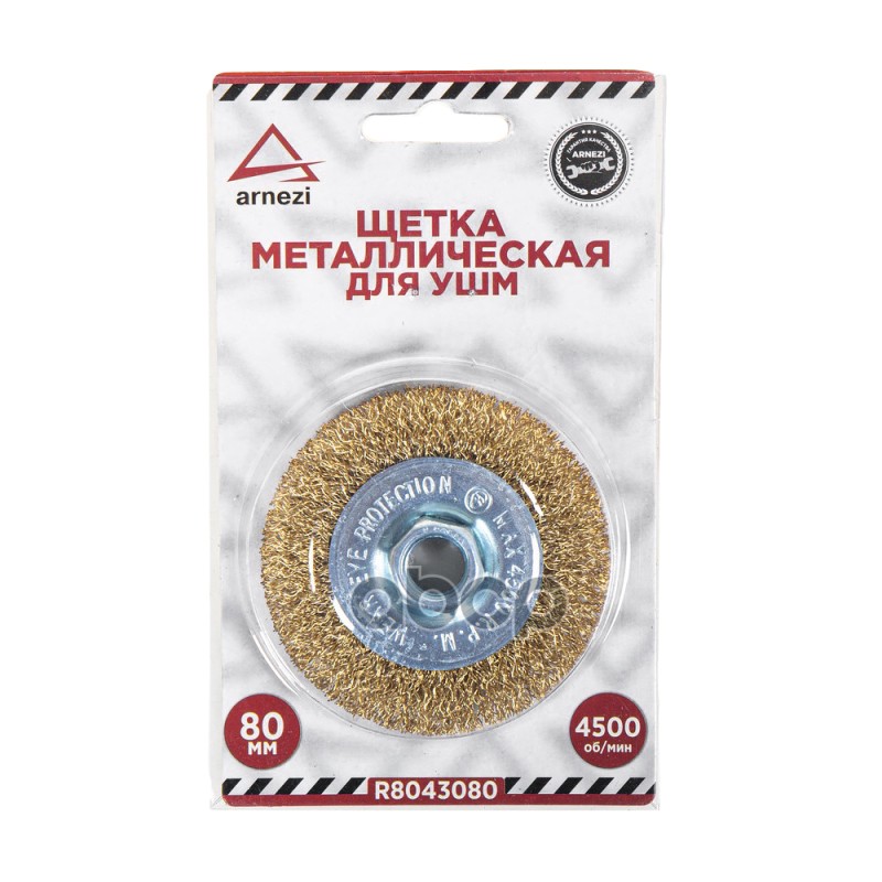 Наименование: Щетка для УШМ плоская 80 мм, посадка M14, латунированная проволока d=0.3мм, 4500 об/мин ARNEZI R8043080 Щетка для УШМ плоская 80 мм, посадка M14, латунированная проволока d=0.3мм, 4500 об/мин ARNEZI R8043080