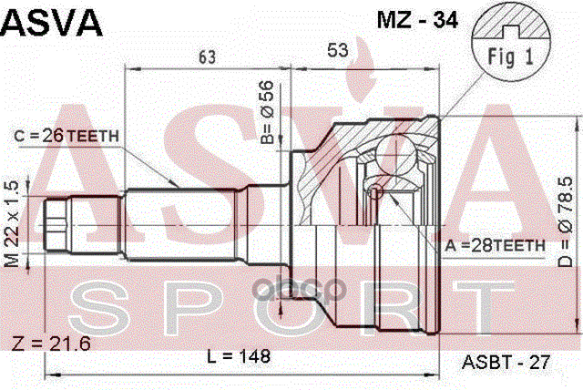 Бренд: ASVA, артикул: MZ34, ШРУС наружный 28x56x26 MAZDA Familia 323 LASER (BJ3P) 1.3,(BJ5P) 1.5 98-. |
