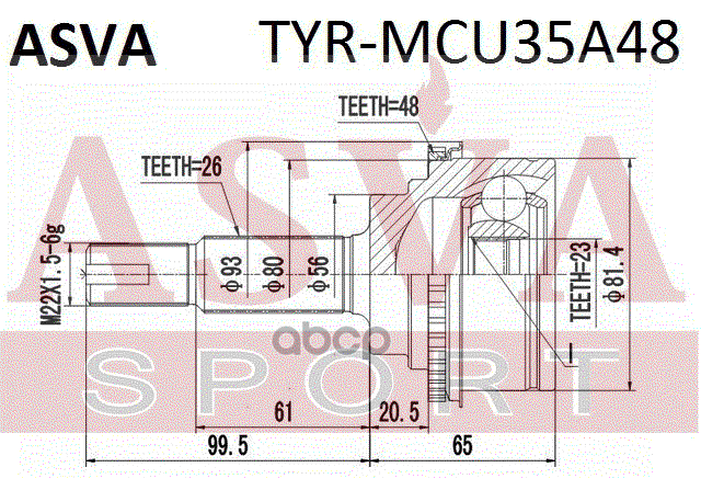 Бренд: ASVA, артикул: TYRMCU35A48, ШРУС наружный задний 23x56x26 TOYOTA HIGHLANDER. |