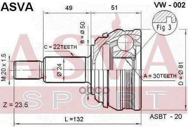 Купить запчасть VW002 ШРУС НАРУЖНЫЙ 30x50x22 с доставкой в Эль-Монте.