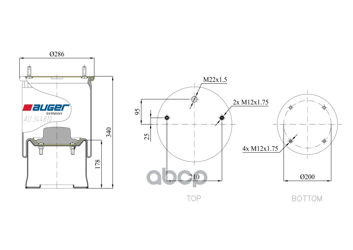 Бренд: AUGER, артикул: AU344810K16, ПНЕВМОПОДУШКА СО СТАЛЬНЫМ СТАКАНОМ SAF, 328X340. |