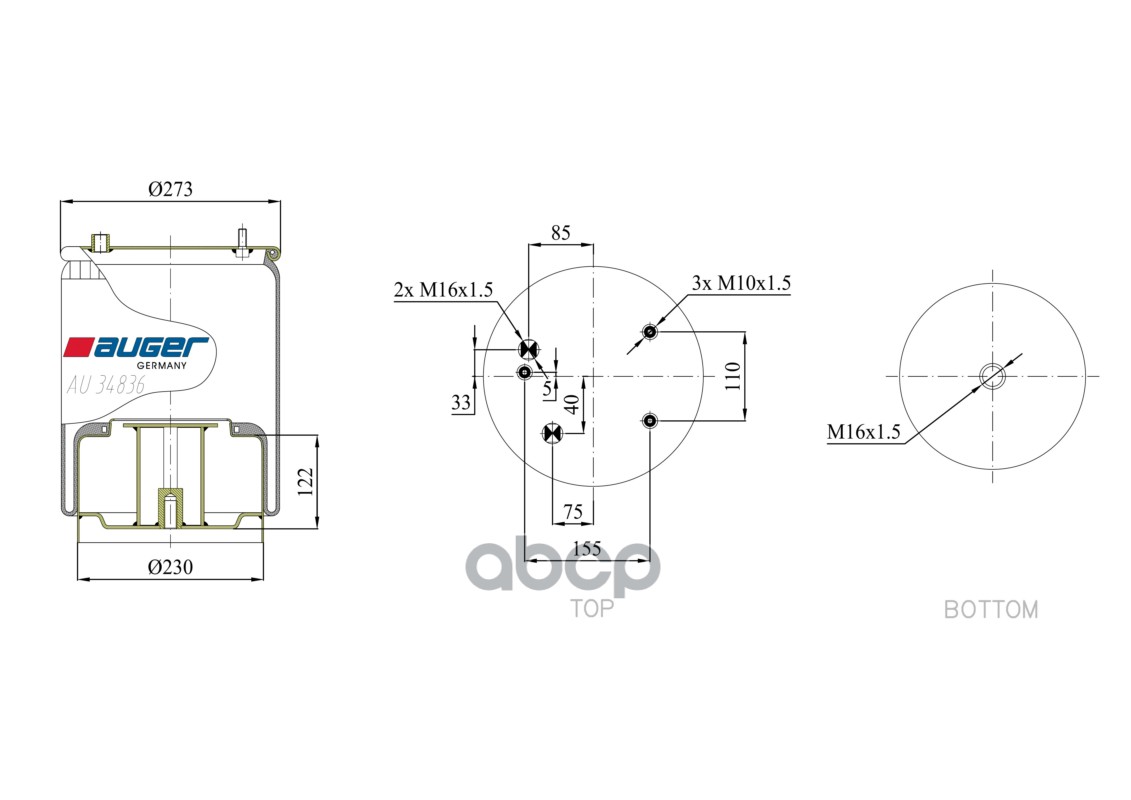 Бренд: AUGER, артикул: AU34836K18, ПНЕВМОПОДУШКА СО СТАЛЬНЫМ СТАКАНОМ DAF, 273X268 H. |