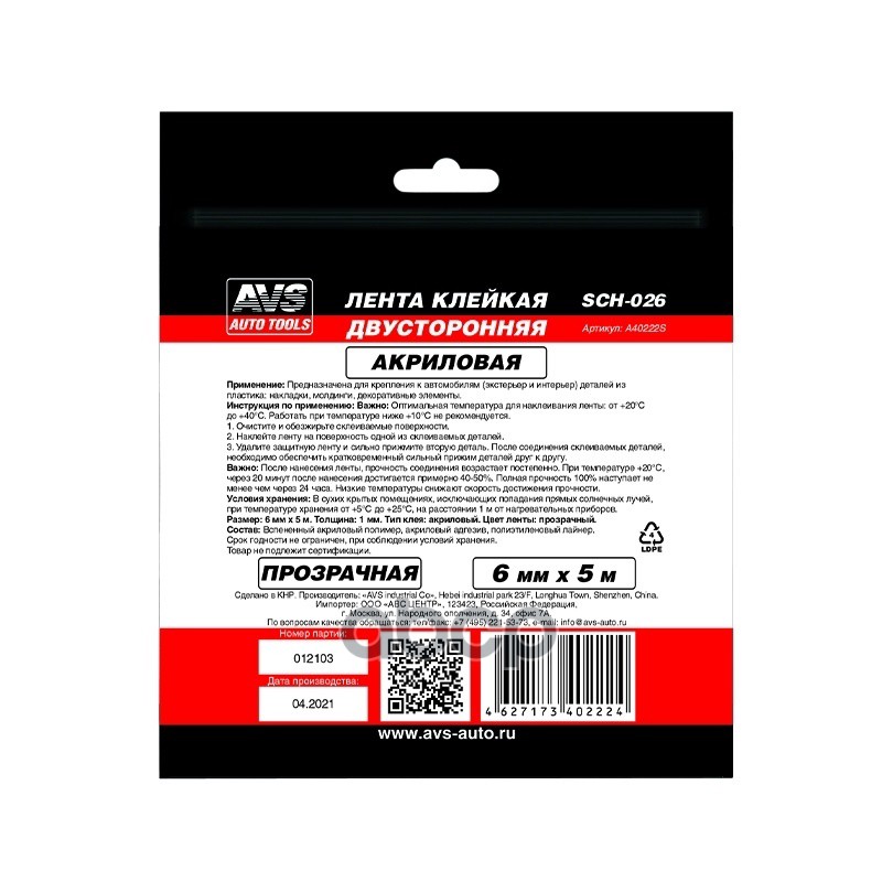 Купить запчасть A40222S Скотч двухсторонний AVS 6 мм x 5 м прозрачный с доставкой в Эль-Монте.