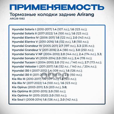 Купить запчасть ARG281082 Колодки дискового тормоза зад. Hyundai (Solaris 10-22, Elantra.,Tucson 19-, Sonata 14-) KIA (Soul I 08-11/19-/Rio 12-17, Optima 15-) с доставкой по России.