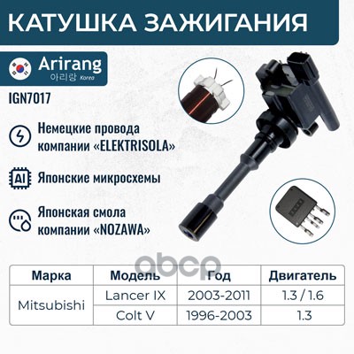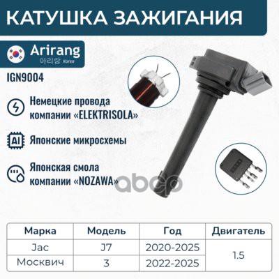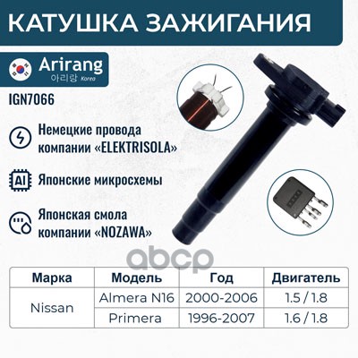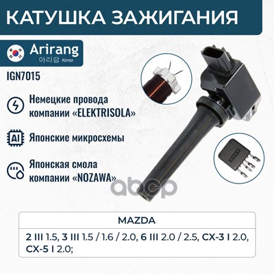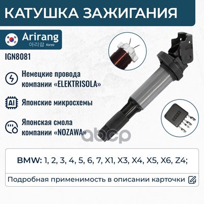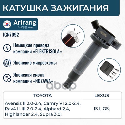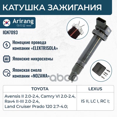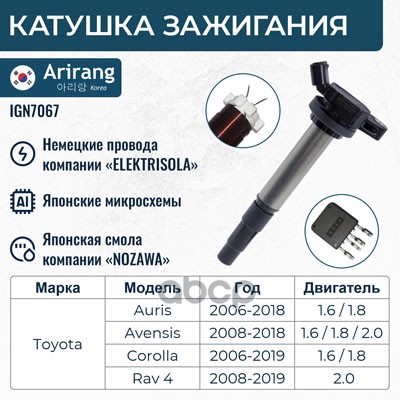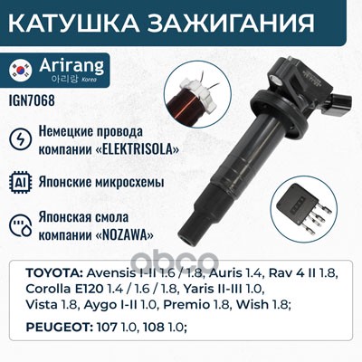 Катушка зажигания Toyota Corolla (E120,E150) 99-, Avensis (T220, T250), RAV-4 00-, Yaris 05- ARIRANG 9091902262 ; 90919T2002 ; 90919T2006 ; 90919W2001 ; 9091902239 ; 9008019015 ; 9008019019 ; 6908009 ; 6100020 ; 1640002 ; 112083 ; 245178 ; 32056 ; MIC103