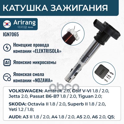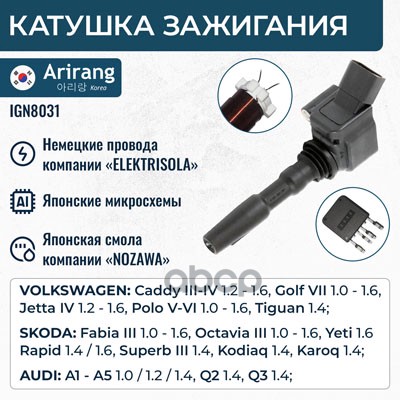 Катушка зажигания VW (Golf VII 12-16/Jetta VI 10-18/Passat B8 14-20), Skoda (Fabia III 14-21/Octavia III 13-16/Yeti I рейсталинг 13-18), Audi (A1 I restyle 14-18/A3 13-16/Q3 15-18)