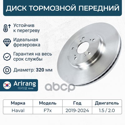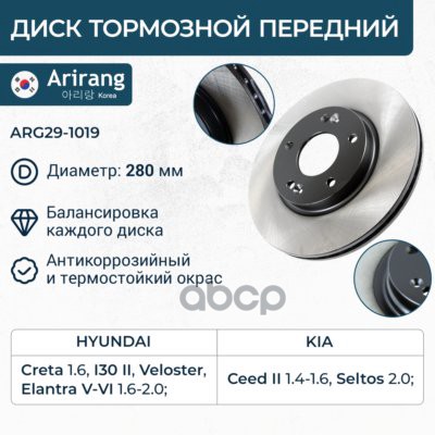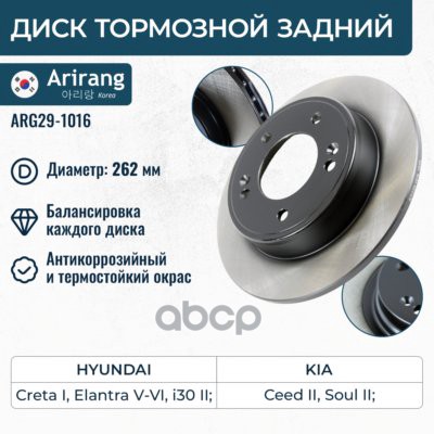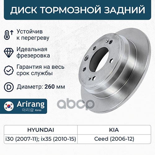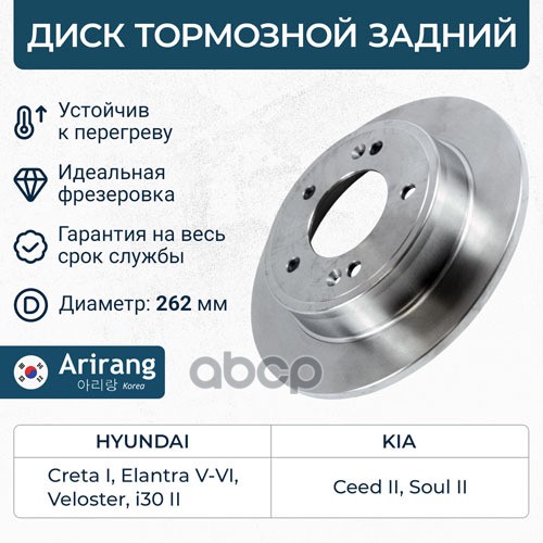 Диск тормозной Hyundai Creta 16-, Elantra 10-; Kia Ceed (JD) 12-, Cerato 18- задний 262 x 10 ARIRANG ARG291018 08C17221 ; 58411A6300 ; PBD1898 ; AMDBD266 ; BN1535 ; BS0469 ; SD1085