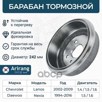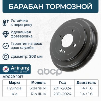 Барабан тормозной Hyundai Accent (ТагАЗ) 180 x 45 ARIRANG ARG29-1020 5841122100 ; 5841125010 ; 5271002000 ; 5271002100 ; 5271002300 ; 5271002500 ; 5271002550