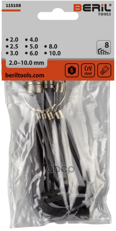 Бренд: BERiL TOOLS, артикул: 115108, Набор шестигранников 8 пр. 2-10 мм на кольце BERiL 10499. |