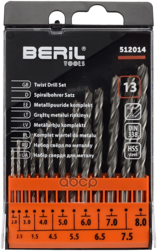 Бренд: BERiL TOOLS, артикул: 512014, Набор сверл по металлу BERiL 13 шт. 2,0-8,0 мм пластиковый футляр 13735. |