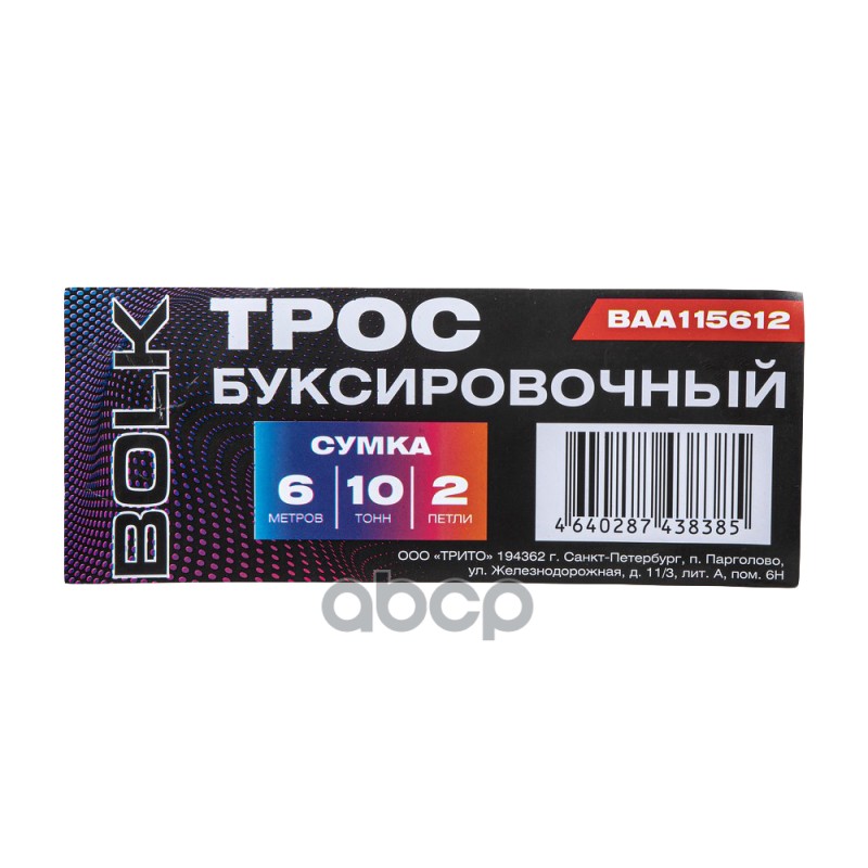 Наименование: Трос буксировочный 6 м,10 т. 2 петли, сумка BOLK B