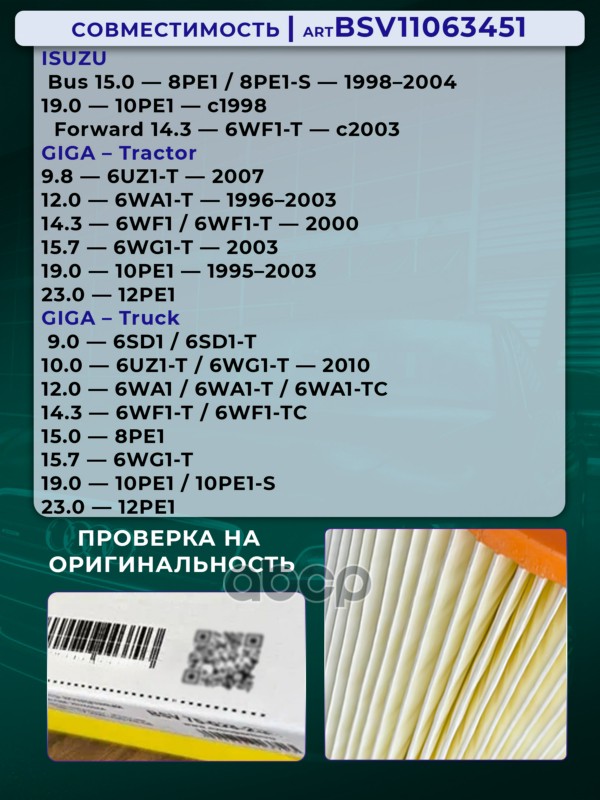 Купить запчасть BSV11063451 Фильтр воздушный TRUCK ISUZU Forward, TractorGIGA с доставкой в Эль-Монте.