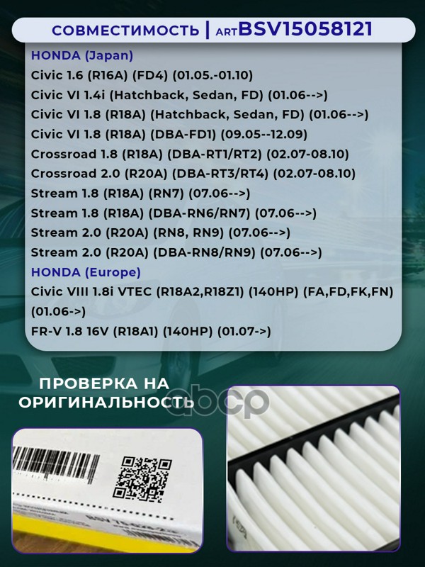 Купить запчасть BSV15058121 Фильтр воздушный HONDA Civic1.4 1.8 06- с доставкой по России.