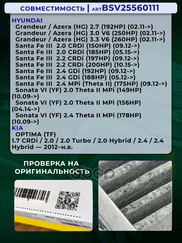 Купить запчасть BSV25560111 Фильтр салонный уголь HYUNDAI Sonata с 11г.-Santa Fe с 12г.-KIA Optima с 12г.- с доставкой по России.