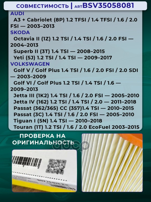 Купить запчасть BSV35058081 Фильтр воздушный AUDI A3 8P, SEAT Altea, Leon II с доставкой в Эль-Монте.