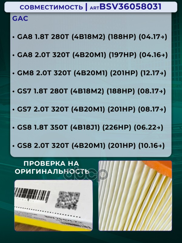 Купить запчасть BSV36058031 Фильтр воздушный GAC GS8GN8 c 16г.- с доставкой в Эль-Монте.