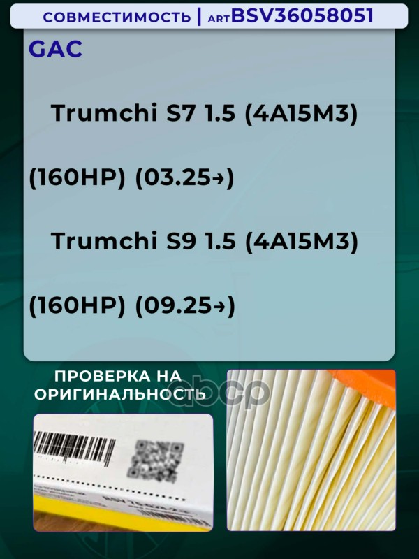 Купить запчасть BSV36058051 ФИЛЬТР ВОЗДУШНЫЙ GAC TRUMCHI S7 1.5 С 25Г.-TRUMCH с доставкой по России.