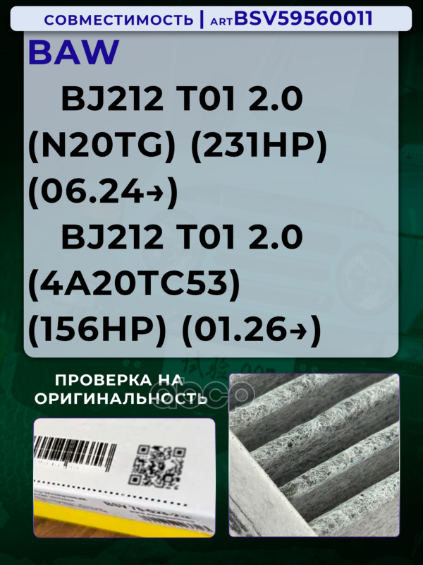 Купить запчасть BSV59560011 Фильтр салонный уголь BAW BJ212 T01 2.0 с 24г.- с доставкой по России.