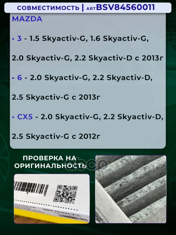 Купить запчасть BSV84560011 Фильтр салонный PRO увеличенный ресурс MAZDA 3 с с доставкой по России.