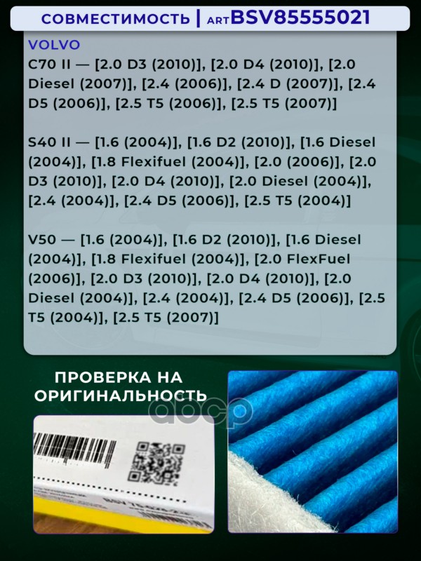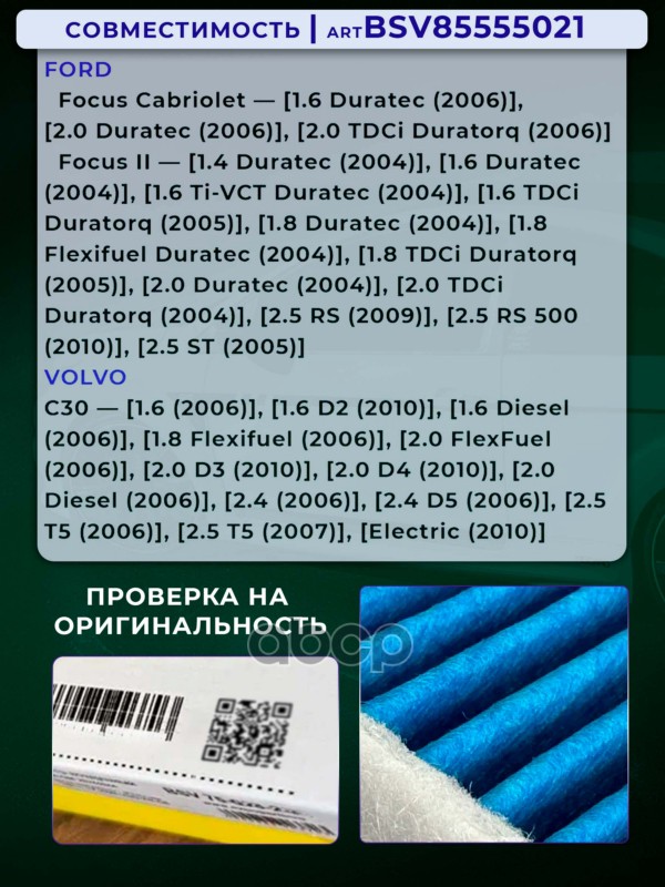 Купить запчасть BSV85555021 Фильтр салонный PRO увеличенный ресурс FORD Focus 2,Mondeo 4,C-Max,S-Max,C-MaxVOLVO C30,C70,S40,V с доставкой по России.