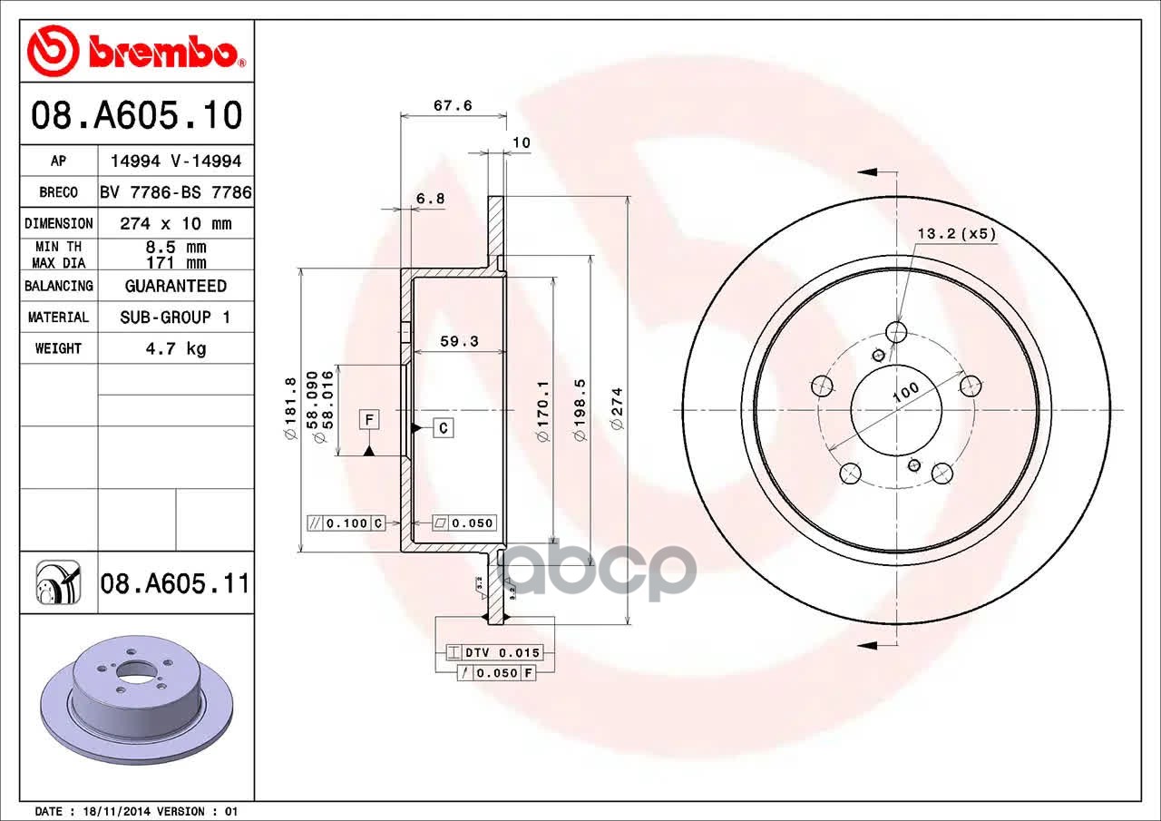 Бренд: Brembo, артикул: 08A60511, Диск тормозной UV Coated | зад | SUBARU OUTBACK (BL, BP) 2.5 AWD (BP9) 11.2003 - 09.2009 <=> SUBARU OUTBACK (BL, BP) 2.5 AWD 09.2008 - 09.2009 BN-1919;FX-1474;GD0101;DF 220109;TB215345;DP-706C;3060-145;92167800;DF6290;170764;BR27112;RN1509;0 986 479 A82;1. |