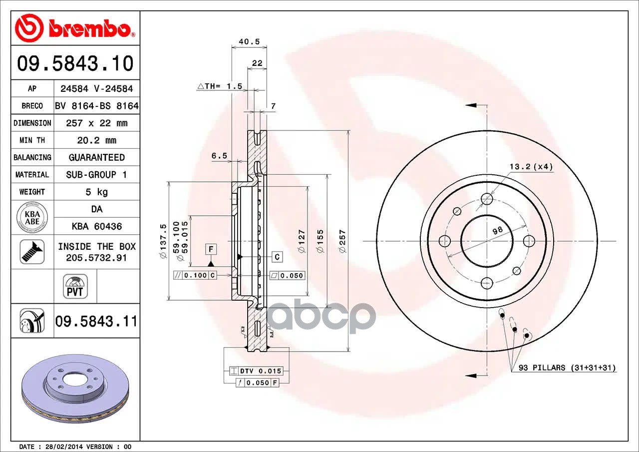 Наименование: Диск торм. пер. вент.[257x22] 4 отв. FIAT 500 07->/Bravo II 07->/Fiorino 08->/Idea 03->/Linea 07->/Panda 04->/Qubo 08->/Stilo 03-08