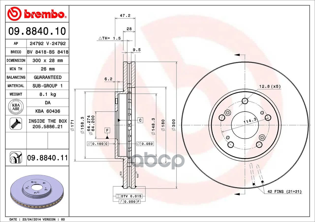 09.8840.11 диск тормозной передний с покрытием Honda Accord 2.4, Acura CL/MDX/TL 99-06