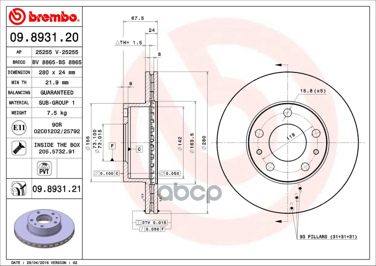 Купить запчасть 09893121 ТОРМ.ДИСК ПЕР.ВЕНТ.280X24 5 ОТВ.MIN2 с доставкой по России.