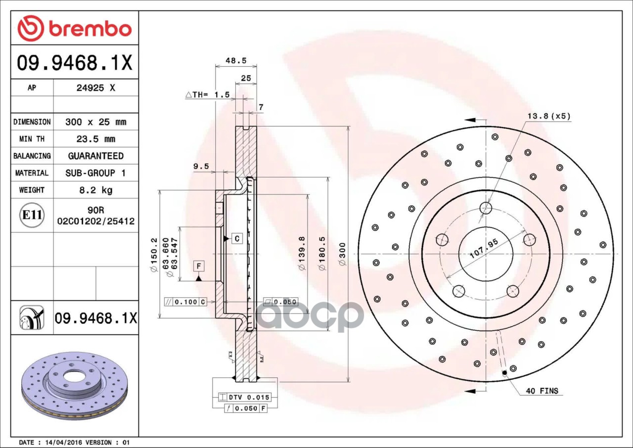 Наименование: 09.9468.1X диск тормозной передний перфорир Volvo S40/V50 1.8/2.4/2.5/2.0TD 04>