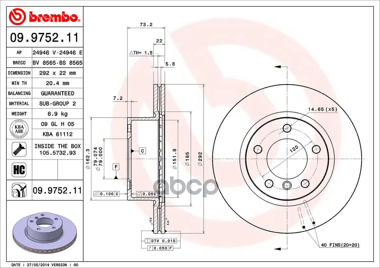 Купить запчасть 09975211 Диск торм. пер.вент.[292х22] 5 отв. BMW E87 120D/120i 09/04->/E90 320i 01/05-> с доставкой по России.
