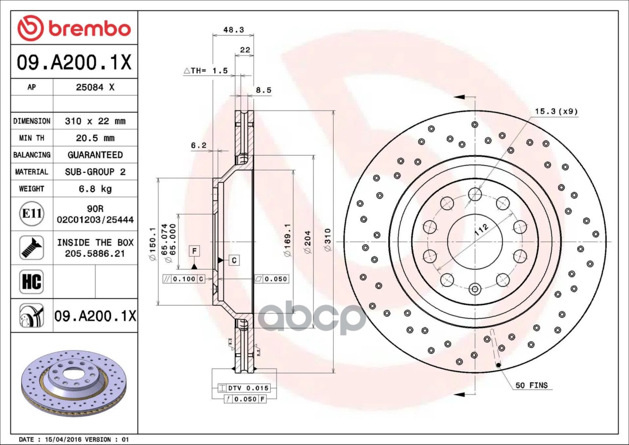 Наименование: 09.A200.1X BREMBO Диск тормозной задний AUDI A3 8P1 0503-0812AUDI A3 8V1, 8VK 0412AUDI A3