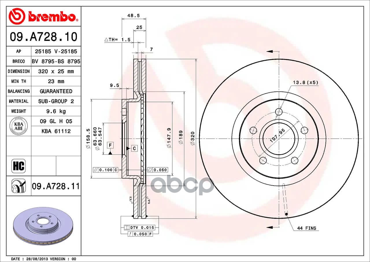 09.A728.11 диск тормозной передний Volvo S40/V50 2.5 AWD 04>, Ford Focus 2.5 05>