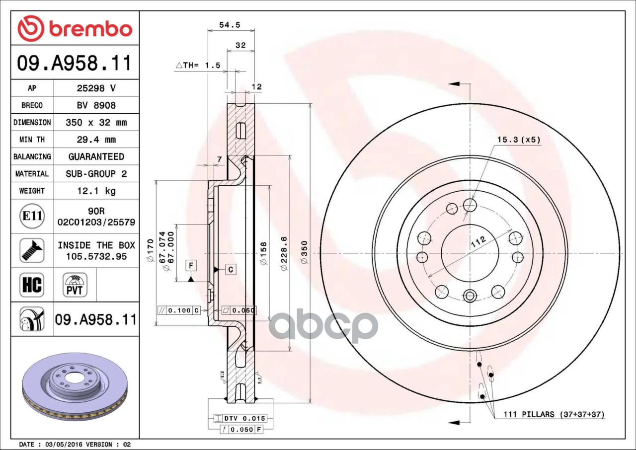 Купить запчасть 09A95811 Диск тормозной передний вентилируемый D=350мм с доставкой по России.