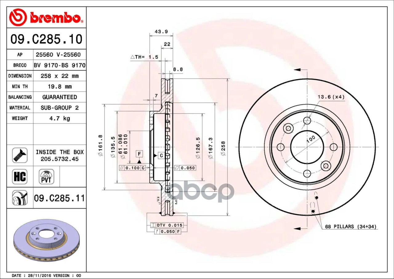Купить запчасть 09C28511 Диск тормозной RENAULT LOGAN 2/SANDERO 12- передн.258мм. с доставкой по России.