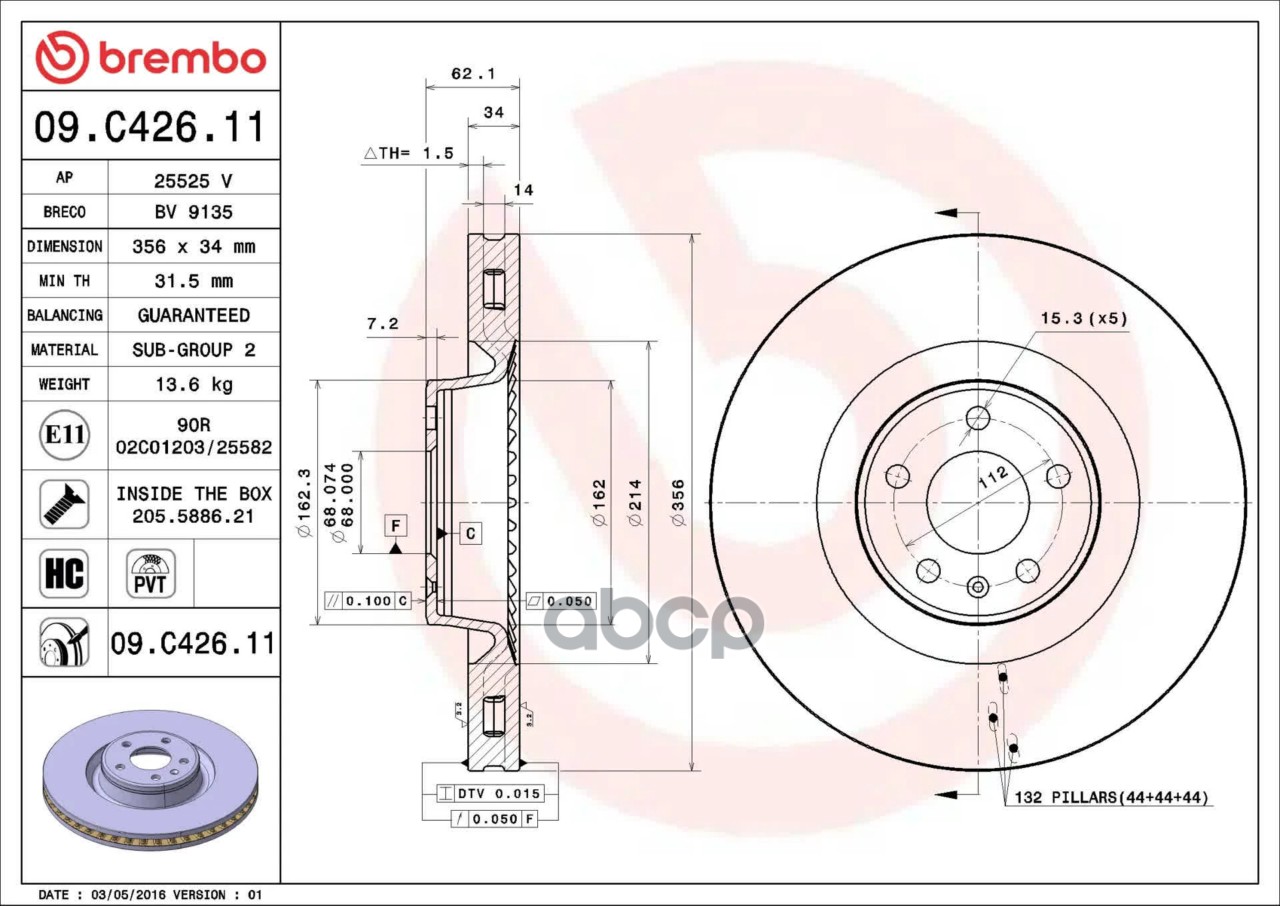 Купить запчасть 09C42611 Диск торм. пер. вент. [356x34] 5 отв. AUDI A6 12-> с доставкой по России.