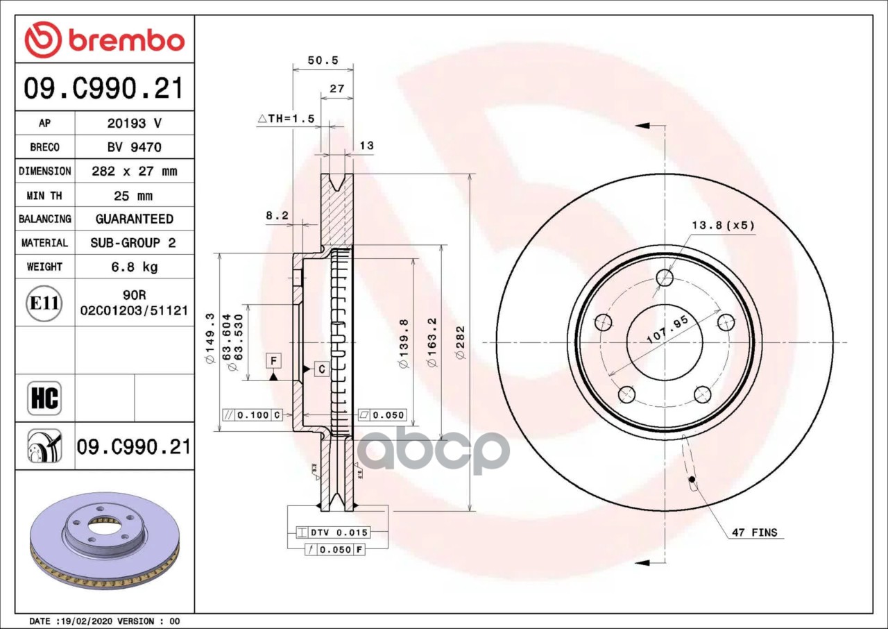Наименование: 09.C990.21 BREMBO, Диск тормозной перед FORD FOCUS 18-, КИТАЙ