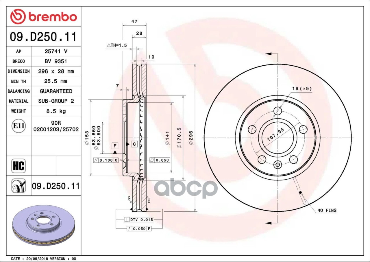 Купить запчасть 09D25011 Тормозной диск передний D296mm VOLVO ASIA S60 12 арт. 09.D250.11 с доставкой по России.