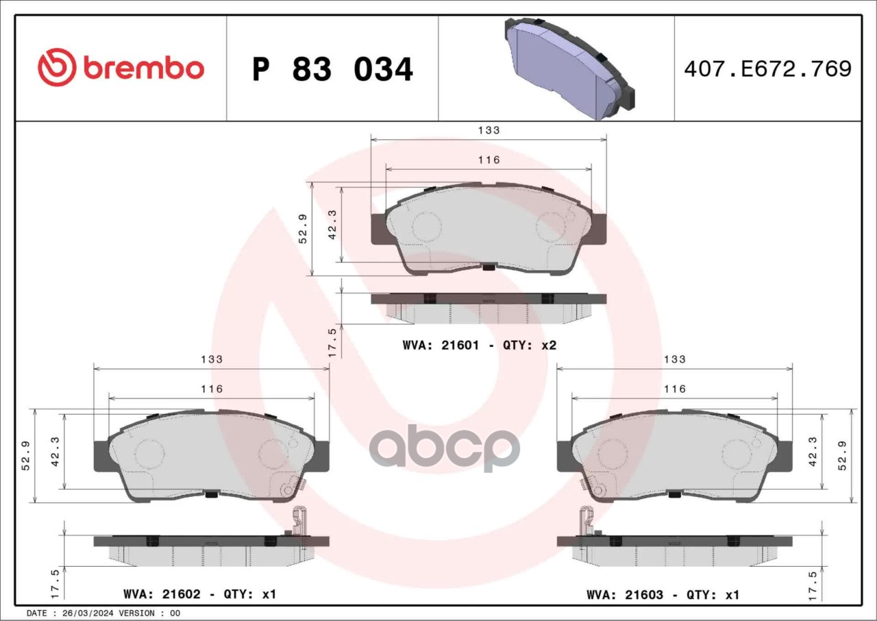 Наименование: BREMBO P83034 Колодки тормозные передние